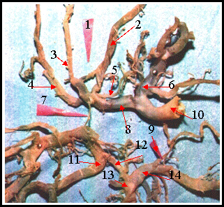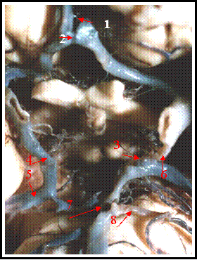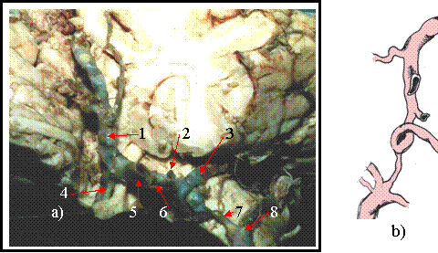 1.artera crebrala mijlocie. 2- artera coroidiana anterioara (-sectionata). 3- artera cerebrala posterioara. 4- ACA-1 5- artera carotida interna. 6- artera comunicanta posterioara. 7- artera cerebrala posterioara - ACP-1. 8- artera bazilara.