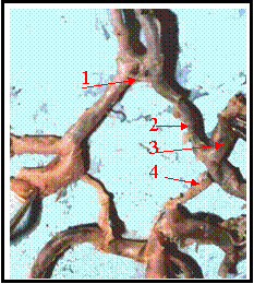 1.-artera cerebrala mediana. 2- artere comunicante anterioare. 3- formatiune anevrismala pe comunicanta anterioara. 4- depuneri ateromatoase pe cerebrala anterioara.