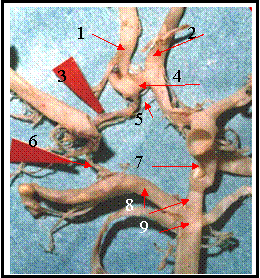 1-.segmentul A-1 al cerebralei anterioare stangi. 2.-.segmentul A-2 al cerebralei anterioare stangi. 3-.artera cerebrala anterioara mediana. 4.-artere comunicante anterioare. 5- prima comunicanta anterioara. 6.- butoniera arteriala. 7.- comunicanta posterioara. 8.- segmentul P-2 al cerebralei posterioare drepte. 9.-.segmentul P-1 al cerebralei posterioare drepte.