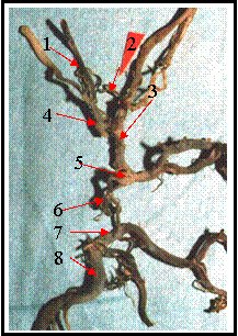 1.-artera comunicanta anterioara accesorie. 2- anastomoza latero-laterala-comunicanta anteioara. 3- formatiune anevrismala pe cerebrala posterioara stanga-P-1.4 - comunicanta posterioara dreapta 5- cerebrala posterioara dreapta P-2 cu origine carotidiana. 6- artera comunicanta posterioara stanga 7- bifurcatia arterei bazilare. 8- artera cerebloasa superioara