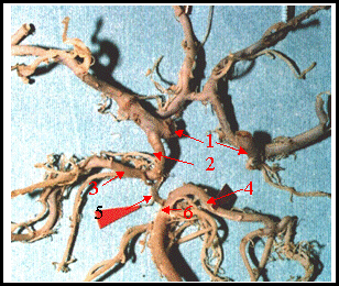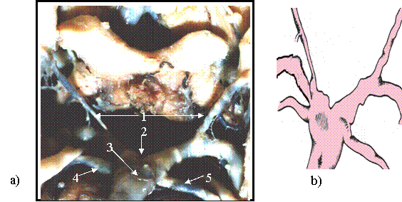 1,segmentul A-2 al cerebralei anterioare drepte. 2-segmentul A-2 al cerebralei anterioare stangi. 3- dilatatii anevrimale pe segmentul A-1 al cerebralei anterioare drepte. 4- comunicanta anterioara. 5- comunicante posterioare