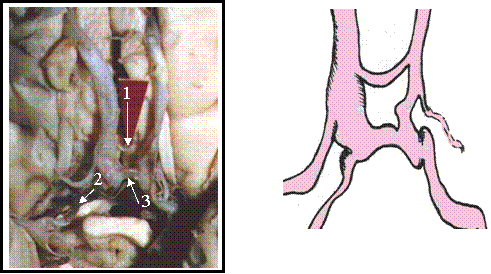 1.-artera comunicanta anterioara fenestrata. 2.-artera cerebrala anterioara A-1 stanga. 3- artera carotida interna stanga. 4- artera comunicanta posterioara stanga.