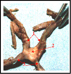 1.artera cerebrala anterioara dreapta 2.-artere comunicante anterioare accesorii. 3- butoniera vasculara realizata de artera comunicanta anterioara.