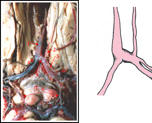 1- artera cerebrala anterioara mediana, unica. 2.- artera carotida interna dreapta. 3 - artere cerebrale posterioare stangi cu origine in carotida interna stanga. 4 - artera counicanta posterioara dreapta. 5.- artera cerebrala posterioara stanga cu origine in trunchiul bazilar. 6-artera coroidiana anterioara dreapta.