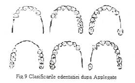 4. Clasificarea lui Applegate aduce, in 1958, completari clasificarii lui Kennedy, asociind la criteriul topografic, elemente de fiziologie si terapie ale edentatiei partiale. Applegate imparte edentatiile in sase clase dupa localizarea breselor, dupa valoarea dintilor stalpi, dupa tipul protezelor proiectate (impartind clasa a III-a a lui Kennedy in subclase), corespunzatoare protezelor partiale diferentiate (fig.9).