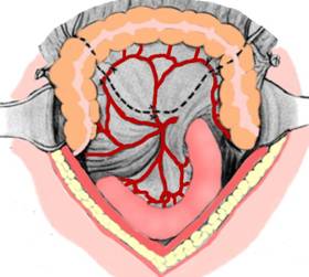Fig. 10 - Colectomie segmentara pe transvers: delimitarea sectiunilor vasculare in mezocolon si linia de sectiune colica (7)