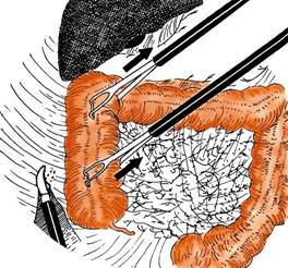 In continuare, sunt sectionate aderentele naturale laterale ale colonului utilizand foarfecele cu electrocauter plasat in trocarul inferior drept. Rareori, vasele mici ale repliurilor peritoneale laterale pot necesita clipuri, suturi, cauterizare uni- sau bipolara.