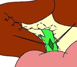 Fig. 1 - Coledocotomie longitudinala. Fire de reper transfixiant (dupa I. Juvara) (1)