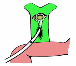 Fig. 4. Extragerea unui calcul din coledocul inferior cu sonda Fogarty (dupa I. Juvara) (1)