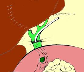 Fig.2 - Extragerea unui calcul din teritoriul biliar superior cu pensa de calculi (dupa I. Juvara) (1)