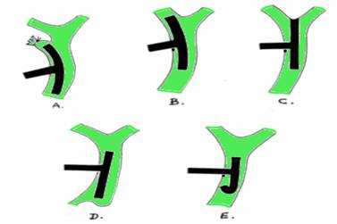 Fig. 5 - Cauze ale nefunctionalitatii tubului Kehr: A. ram superior introdus in cistic; B. ram superior introdus in canalul hepatic drept; C. ram superior ce buteaza in convergenta; D. ram inferior angajat intr-un diverticul coledocian; E. ram inferior cudat (1)