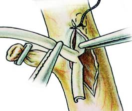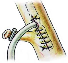 Fig. 11 - Sutura coledocotomiei cu fire separate, pe tubul Kehr