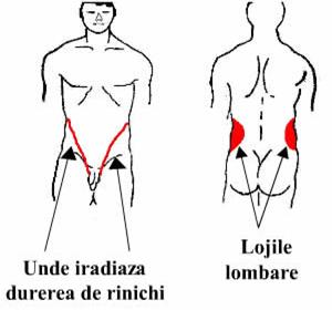 Este elementul dominant sau chiar unic al colicii renale. Ea poate incepe cu o jena in regiunea lombara care creste repede in intensitate. Ea are sediul in regiunea lombara, la nivelul coastei a 12-a si desi este continua are excerbari paroxistice greu de suportat, care pot uneori determina manifestari reflexe. De cele mai multe ori durerea este de la inceput violenta:
