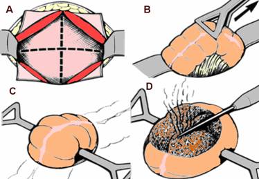 Fig. 5. Colostomia iliaca stanga laterala: A. Dupa disocierea fibrelor muschiului drept se sectioneaza in cruce foita posterioara a tecii sale; B. Exteriorizarea buclei sigmoidiene; C. Introducerea baghetei transmezocolic care va face oficiul de sicana; D. Electrocoagularea suprafetei externe a viitoarei stome, ce va permite deschiderea spontana secundara (1)