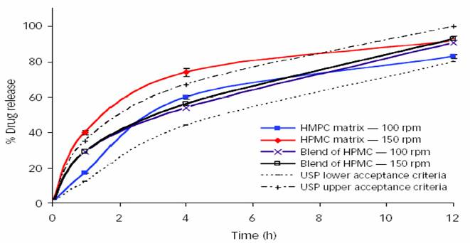 Amestecarea polimerilor cu grade diferite de vascozitate a condus de asemenea la caracteristici fizice imbunatatite, s-au constatat profile de dizolvare similare la viteze de agitare de 100 si 150 rpm (Figura 12). Acest exemplu demonstreaza ca, prin combinarea polimerilor HPMC, nu doar s-a modulat profilul de eliberare la gradul dorit, ci a rezultat un sistem de matrici mai robust.