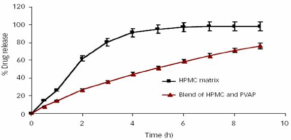 S-au produs matrici cu o combinatie de PVAP si HPMC, ce contin clorhidrat de verapamil. Cand formularea a fost supusa dizolvarii conform metodei I din USP 28 in fluid gastric o ora, urmat de fluid intestinal 2-8 ore, s-a constatat o eliberare mai lenta din formularile cu amestecuri de polimeri, decat din matricea cu un singur tip de HPMC (figura 13).