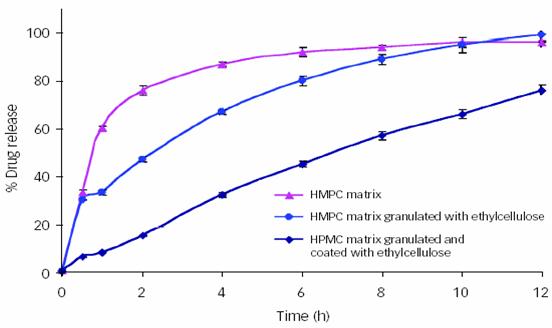 Aici, clorhidratul de venlafaxina, care este foarte solubila, a fost granulata umed cu etilceluloza inainte de incorporarea matricii HPMC. Mai departe, formularea a fost modificata prin filmarea matricilor cu un film de etilceluloza, pentru a opri eliberarea initiala brusca.