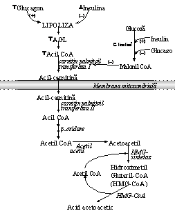 AGL, patrunsi in citoplasma hepatocitara, nu mai sunt dirijati spre sinteza de trigiliceride sau fosfolipide, ci prin intermediul acilcarnitiltrans-ferazei, sunt transferati (sub forma activata, prin cuplare cu coenzima A) in mitocondrii. Acest proces este facilitat si de lipsa efectului frenator al malonil CoA asupra patrunderii acizilor grasi in mitocondrii, intrucat acest produs de metabolism este obtinut prin glicoliza (redusa in absenta insulinei). Betaoxidarea in mitocondrie a acizilor grasi se insoteste de productia crescuta de acetil coenzima A. Utilizarea se face preferential spre sinteza de corpi cetonici, functia ciclului Krebs fiind limitata (prin scaderea productiei de oxalacetat), cantitatile de acetil CoA depasind cu mult posibilitatile de metabolizare in cadrul ciclului acizilor tricarboxilici.
