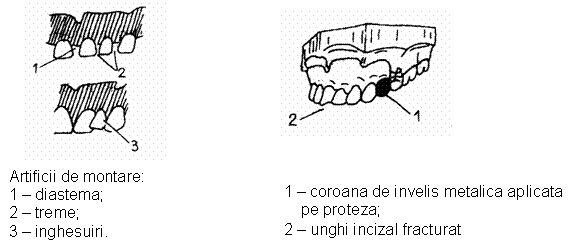 pentru crearea senzatiei de naturalete si mascarea protezarii, la cererea pacientilor se pot utiliza: culori mai inchise ale dintilor artificiali, cu zone de culoare diferita simuland obturatiile, dintii artificiali abrazati sau cu unghiuri incizale rotunjite sau fracturate, coroane sau fatete metalice pe anumiti dinti (canini, premolari).