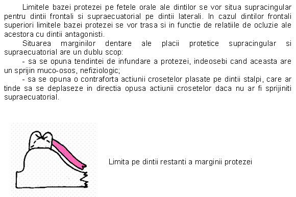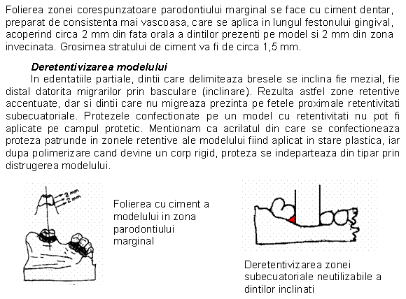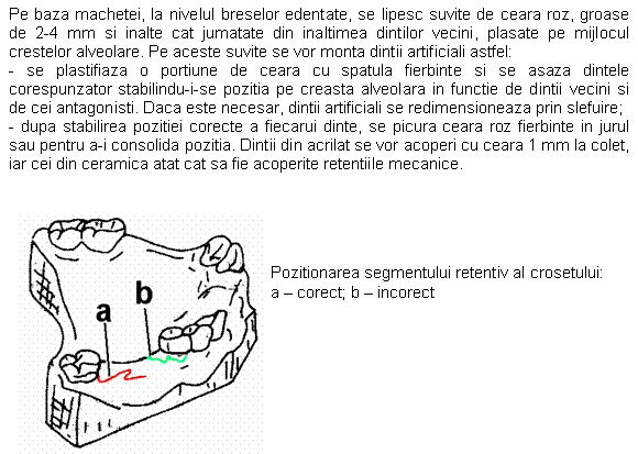 Pentru montarea dintilor artificiali se adapteaza, pe modelul umezit, o placa de ceara roz plastifiata in limitele trasate, inclusiv, pe fetele orale ale dintilor restanti. Se confectioneaza astfel baza machetei, care se lipeste cu ceara fierbinte de model in 2-3 locuri.