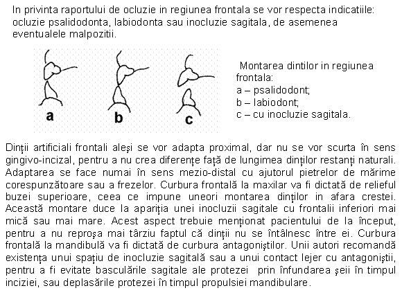 Pentru edentatiile reduse sau de grup din regiunea frontala, chiar daca tehnicianul nu primeste nici o indicatie in fisa, dintii restanti si cei antagonisti sunt criteriile cele mai obiective pentru pozitionarea dintilor artificiali. Cind lipseste intregul grup frontal, mai ales la maxilar, ca si in edentatii extinse sau subtotale, tehnicianul primeste prin intermediul sabloanelor de ocluzie urmatoarele date: