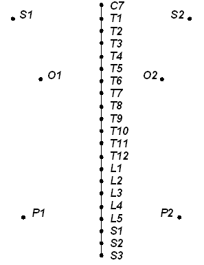 Determinarea parametrilor posturali, a deformatiilor, unghiurilor si lungimilor caracteristice coloanei vertebrale necesita cunoasterea coordonatelor vertebrelor pe o zona cat mai extinsa. In demersul descriptiv si de calcul care urmeaza sa fie prezentat s-a considerat necesara cunoasterea coordonatelor vertebrelor pe un tronson care incepe de la capatul zonei cervicale (C7) pana la mijlocul zonei sacrale (S3).