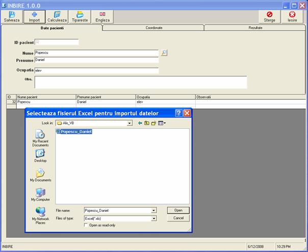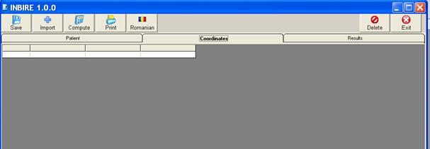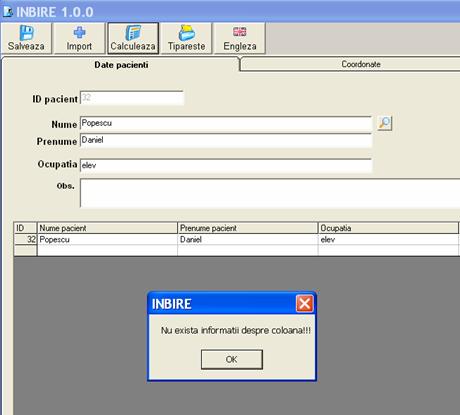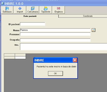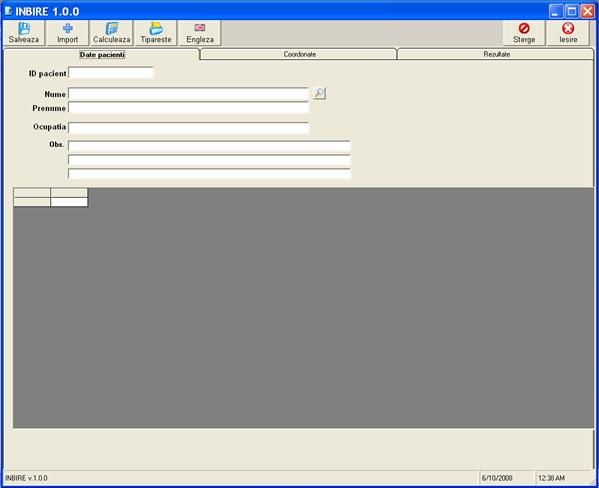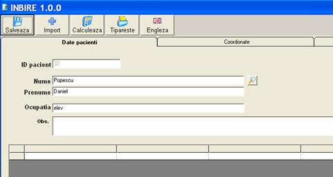 Modulul Form al programului denumit INBIRE este prezentat in figura 17. Controalele TextBox cu etichetele ID pacient/ID Patient, Nume/Name, Prenume/Surname, Ocupatia/Profession permit identificarea unei linii deja existente in baza de date sau introducerea unei linii noi, pentru un pacient neinregistrat in baza.