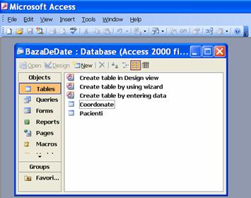 Baza de date (fig. x19) contine doua surse tabelare interconectate: un tabel cu inregistrarile pacientilor (fig. 20) si un tabel cu coordonate atribuite pacientilor functie de numarul de indentificare al acestora din primul tabel (fig. 21).