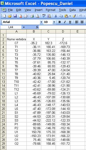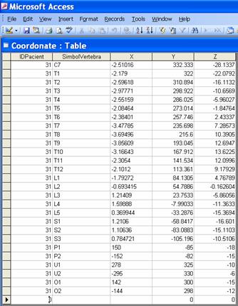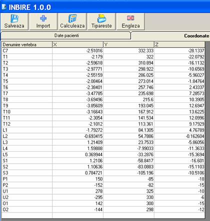 Prima coloana afiseaza simbolul vertebrelor, respectiv al celor sase puncte suplimentare de masurare. Urmatoarele trei coloane contin inscrise valorile coordonatelor (x,y,z) ale celor 27 de puncte necesare calculului parametrilor de interes.