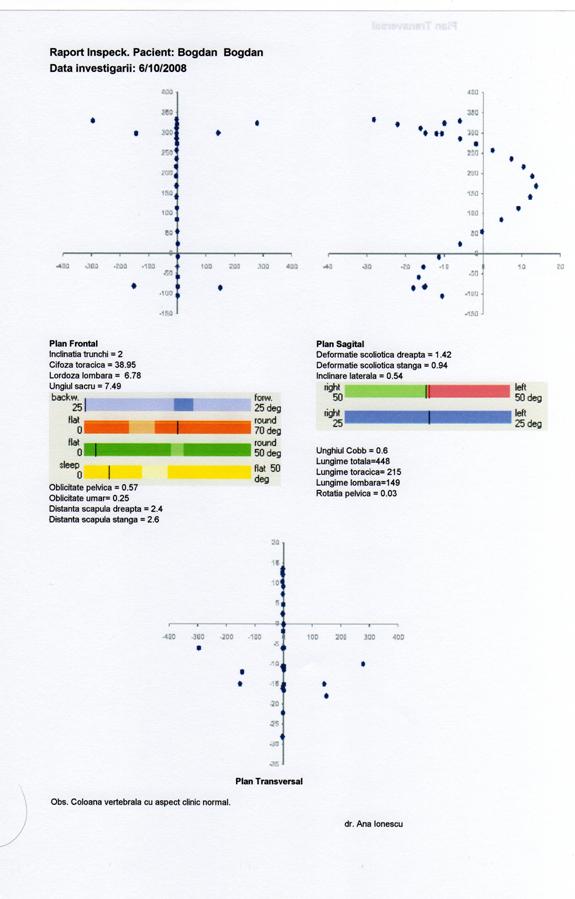 Pentru Inclinatia trunchiului/Trunk inclination, Cifoza toracica/Thoracic Kyphosis, Lordoza lombara/Lumbar lordosis si Unghiul sacru/Sacral angle s-au introdus scale cromatice, pe care figureaza intervalul valorilor normale si linia corespunzatoare valorii parametrului pentru pacientul investigat. Etichetele exterioare scalelor marcheza valoric extensia acestora si indica tendinta de deformatie spre extremitatile scalelor.
