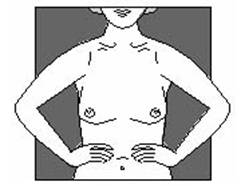Cu mainile ridicate deasupra capului, se examineaza sanii in oglinda, urmarindu-se aceleasi obiective ca la pasul 1. Se prind palmele la nivelul umerilor si se preseaza, cautandu-se aceleasi modificari. |