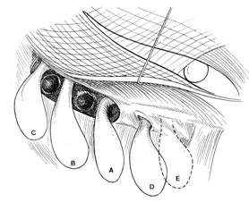 Fig. 1 - Varietati de hernie crurala: A - Forma comuna; B - Hernie prevasculara; C - Hernie crurala externa; D - Hernie Laugier; E - Hernie pectineala (3)