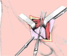 Fig. 2 - Cura herniei crurale pe cale inghinala: deschiderea peretelui anterior al peretelui inghinal (stanga)