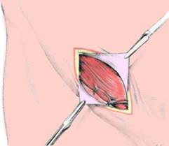 Incizia se face ca la hernia inghinala, mai jos situata, intr-un pliu cutanat. Se face hemostaza vaselor subcutanate, se evidentiaza aponevroza marelui oblic, care este sectionata in lungul fibrelor ca la hernia inghinala. Se pune in evidenta fascia transversalis si coletul herniar care este eliberat de tesuturile din jur (Fig. 2).