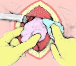 Fig. 3 - Aducerea sacului de hernie crurala in regiunea inghinala si ligatura sa la baza (stanga);
