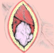 Dupa strangerea si innodarea firelor vom observa daca vasele iliace nu sunt comprimate. Ligamentul rotund la femeie si cordonul spermatic la barbat sunt plasate in pozitie normala, apoi se reface aponevroza marelui oblic.