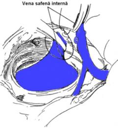 Operatia incepe cu abordul crosei venei safene interne. Calea de acces este, de obicei, o incizie transversala de 4 cm, situata la 1-2 cm sub arcada crurala, intr-un pliu femoral, cu extremitatea laterala la nivelul unde se palpeaza pulsul femural. Incizia transversala ofera lumina suficienta, permite abordul colateralelor, dar descopera mai greu o safena accesorie, atunci cand aceasta exista (Fig. 1). Alti autori prefera o incizie longitudinala.