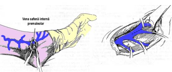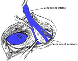 O incizie transversala de 2 cm, plasata la 2 cm mai jos si anterior de varful maleolei interne, descopeai originea trifurcata a venei safene interne. Fiecare din cele trei tributare primare va fi ligaturata si sectionata(Fig. 5). Vena safena este disecata proximal pana la 4 cm deasupra maleolei, colateralele sale anterioare si posterioare fiind expuse, ligaturate si sectionate.
