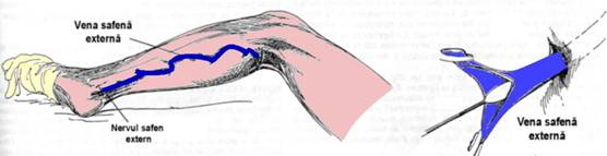 In 20% din cazuri varicele afecteaza si sistemul venos al safenei externe, uni- sau bilateral. In aceste conditii trebuie smulsa si safena externa. Pentru aceasta, se flecteaza genunchiul pacientului la 90º lasand talpa pe masa de operatie si se roteste soldul usor spre interior. Se practica o incizie transversala de 2 cm, intre varful maleolei externe si marginea laterala a tendonului lui Ahile si se identifica ramurile de origine ale safenei externe. Ramurile sunt sectionate si ligaturate si se insera un stripper scurt, care este trecut proximal in trunchiul safen extern pana in regiunea poplitee unde, printr-o mica incizie transversala, sunt descoperite vena si capatul stripperului (Fig.8). Vena este izolata si sectionata, iar capatul proximal se ligatureaza. Safena externa este smulsa retrograd, iar colateralele mari, marcate preoperator, sunt smulse sau extirpate segmentar. Vor fi extirpate venele care conecteaza cele doua trunchiuri venoase pe partea interna a gambei.