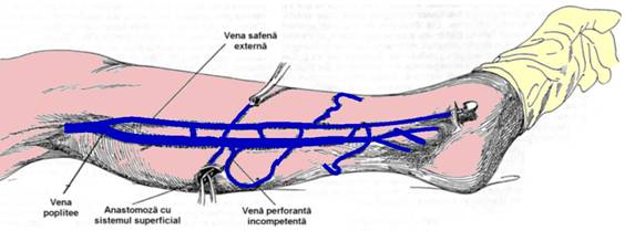 Daca in timpul disectiei se intalnesc venele comunicante, trebuie ligaturate si sectionate. Comunicantele mari, marcate preoperator, vor fi descoperite si ligaturate (Fig.9).