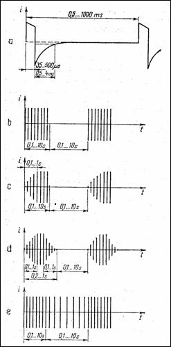 Terapia prin faradizare se foloseste la excitarea cu impulsuri dreptunghiulare a muschilor scheletici (Figura 4.1,a). Pentru muschi paralizati se pot utiliza curenti neofaradici, cu alura exponentiala (b), sau impulsuri modulate in amplitudine cu impulsuri trapezoidale (c). In vederea obtinerii unei contractii accentuate, frecventa de repetitie a trenurilor de impulsuri este de 40.100 Hz.
