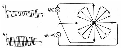 Campul interferential dinamic se produce prin variatia intensitatii celor doi curenti in sensuri contrarii si prin modulatia in amplitudine a curentilor cu un semnal modulator de foarte joasa frecventa, ceea ce duce la rotirea directiei vectorului i (Figura 4.6).