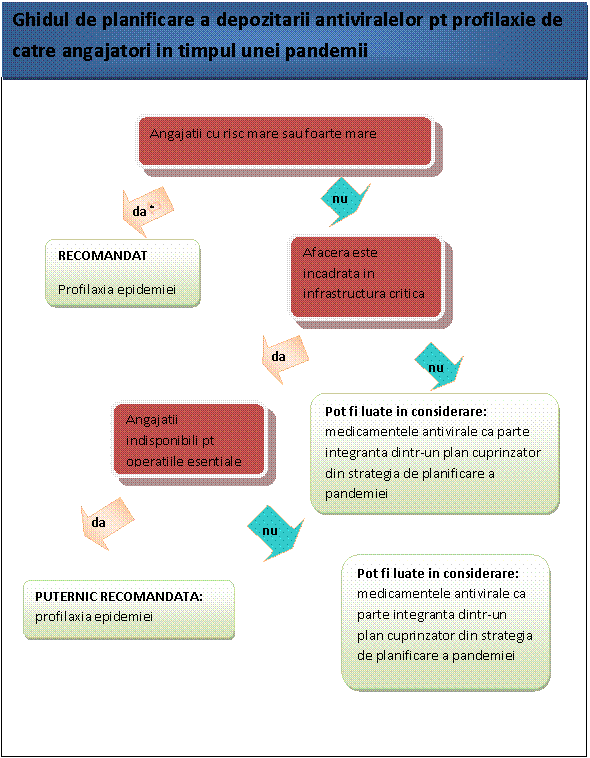 Angajatorii ar putea opta pentru achizitionarea medicamentelor antivirale din anumite motive: (1) sa ofere profilaxie pentru primul ajutor si pentru muncitorii din cadrul serviciilor de urgenta (pompieri, sanctionari legale, si serviciii de urgenta medicala [EMS]) a caror slujba ii supun unui risc foarte mare sau unui risc de expunere mare la infectii; (2) sa ofere profilaxie muncitorilor care sunt critici pentru operatiile esentiale in infrastructura afacerilor critice pentru a sustine provizii ale serviciilor comunitatii esentiale; (3) sa asigure tratament timpuriu angajatilor care se imbolnavesc; (4) sa mentina continuitatea afacerii, si (5) sa protejeze angajatii si activitatile de peste hotare acolo unde actiunile de raspuns ale guvernului US nu vor ajunge. In plus pentru a defini strategia angajatorului de a achizitiona medicamente antivirale si care muncitori trebuie luati in calcul, angajatorii trebuie sa ia in considerare muncitorii care trebuie sa se deplaseze in timpul pandemiei si non-angajatii precum voluntarii si furnizorii. Decizii referitoare la depozitare trebuie luate in contextul planuirii si pregatirii pentru pandemie, in particular pentru acei angajati cu risc mare de expunere la boli severe rezultate in urma complicatiilor gripei pandemice. Interventiile non-farmaceutice ca izolarea persoanelor bolnave, carantina membrilor gospodariei, si distantierea sociala vor constitui prima linie de aparare pentru angajatori in cazul unei pandemii de gripa. Medicamentele antivirale reprezinta numai o ustensila care trebuie luata in considerare in vederea limitarii pandemiei de gripa, deoarece eficienta fundamentala in tratamentul bolilor pandemice nu poate fi prezisa in avans. In plus, este important ca angajatorii sa fie constienti de impactul potential si de efectele secundare potentiale ale medicamentelor antivirale, de cerintele si strategiile legale pentru depozitare si distribuire, de consideratiile etice in furnizarea medicamentelor antivirale pentru o anumita parte sau pentru toata forta de munca, ca si de strategiile de depozitare curente din sectorul public.