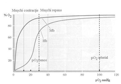 Mb, fiind proteina de rezerva de oxigen, leaga O2 dupa o curba cu aspect hiperbolic, avand afinitate mai mare pentru oxigen decat Hb la orice presiune.
