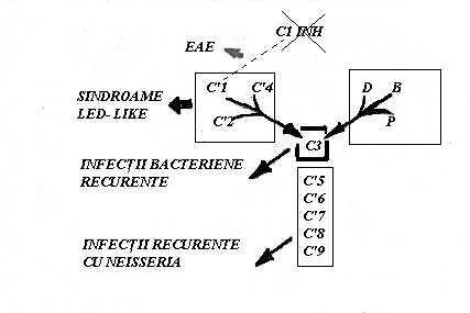 2. o crestere a susceptibilitatii generale la infectii bacteriene in deficienta de C'3 sau o tendinta la infectii recurente cu Neisseria gonococcus sau N. meningitidis in deficienta de C'5, C'7 sau C'8.