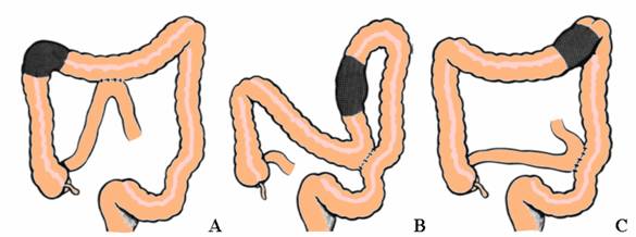 Fig. 1 - Derivatii interne: A-ileo-transversostomia, B-transverso-sigmoidostomia, C- ileo-sigmoidostomia (1)