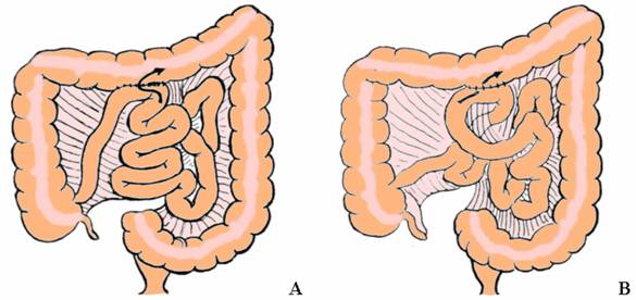 Fig. 2 - Ileo-transversostomie latero-laterala: A. anizoperistaltica; B. izoperistaltica (5)