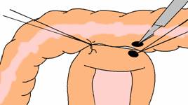 Fig. 3 - Ileo-transversostomie latero-laterala cu staplerul: adosarea ileonului terminal la transvers si mentinerea cu doua fire de reper, crearea a doua orificii in segmentele de intestin ce vor fi anastomozate (1)
