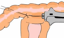 Fig. 4 - Ileo-transversostomie latero-laterala cu staplerul: introducerea staplerului GIA prin cele doua orificii si realizarea anastomozei (1)