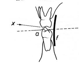 - pozitia retro-dento-gingivala a filmului (f), pozitia in planul ocluzal (muscata) a aripioarei (a) si orientarea fascicului de radiatii (x) in vederea executarii unei radiografii corecte "bitewing" (dupa S.Login).